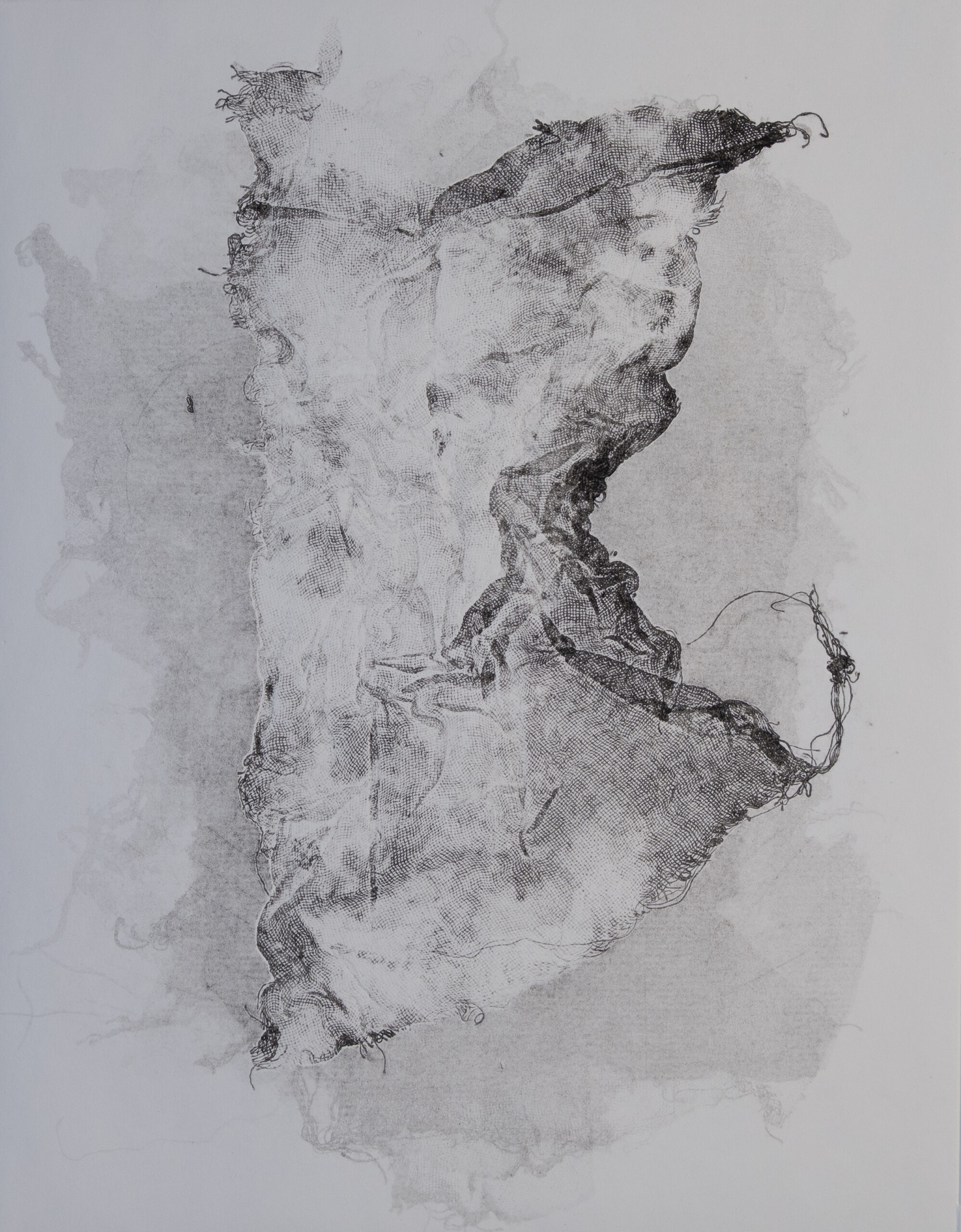 The open structure of the fabric gives the composition its energy. Areas of denser ink contrast with lighter passages, allowing the weave to breathe and shift across the surface. Rather than feeling rigid or mechanical, the marks retain the irregularity of textile material—frayed edges, subtle gaps, and layered intersections that suggest use and movement over time.