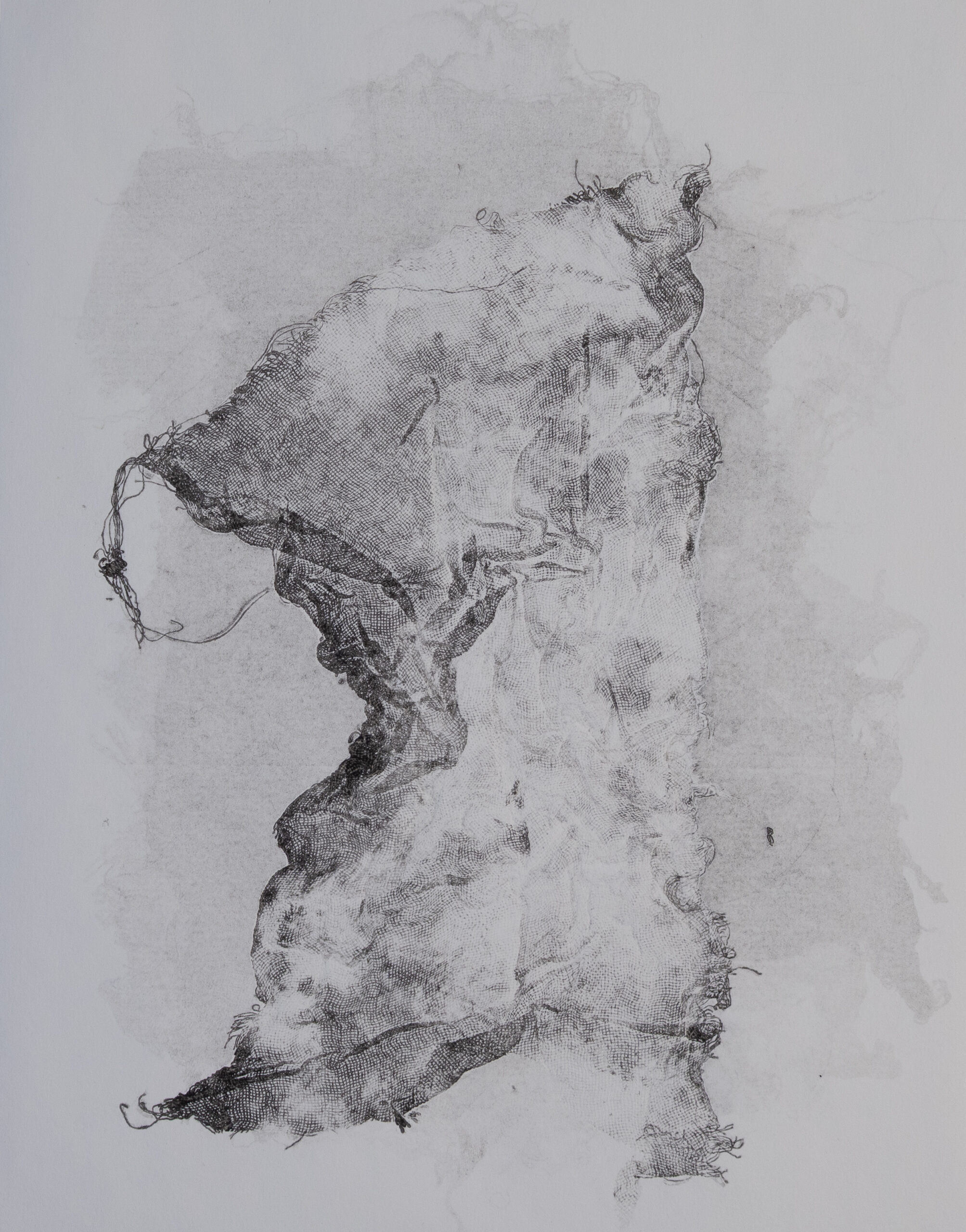 Built from the quiet complexity of fabric, “Dynamic Pairing II” captures a close-up section of loosely woven cloth and transforms it into an energetic abstract composition. The weave is unmistakable—threads intersect, loosen, and fray, creating a surface that feels tactile and alive. Ink gathers unevenly across the fibers, allowing the structure of the cloth to guide the movement rather than constrain it.