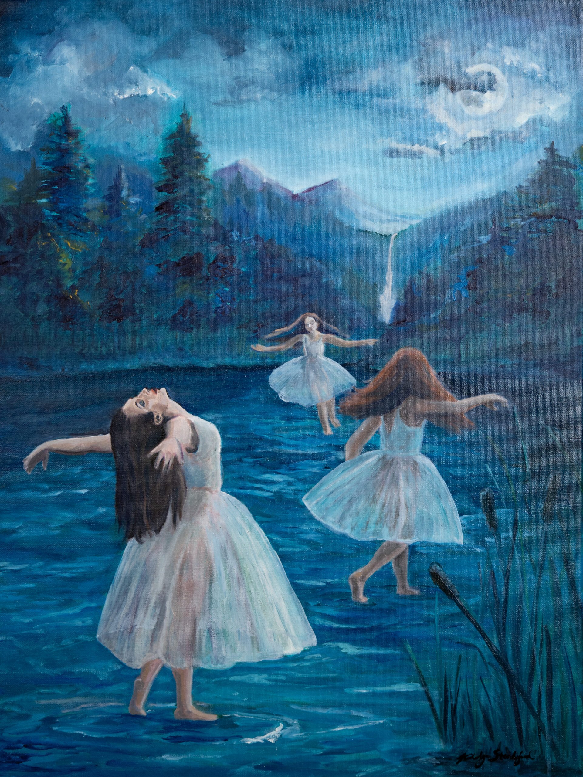 Reedsong” is a surreal, representational oil painting depicting three women dancing across the surface of a moonlit lake. Bathed in the glow of a full moon, their figures move in quiet unison, mirrored by the water below. The cool, atmospheric palette and softly blended brushwork create a sense of fluid motion, as if the scene is unfolding slowly rather than captured in a single instant.