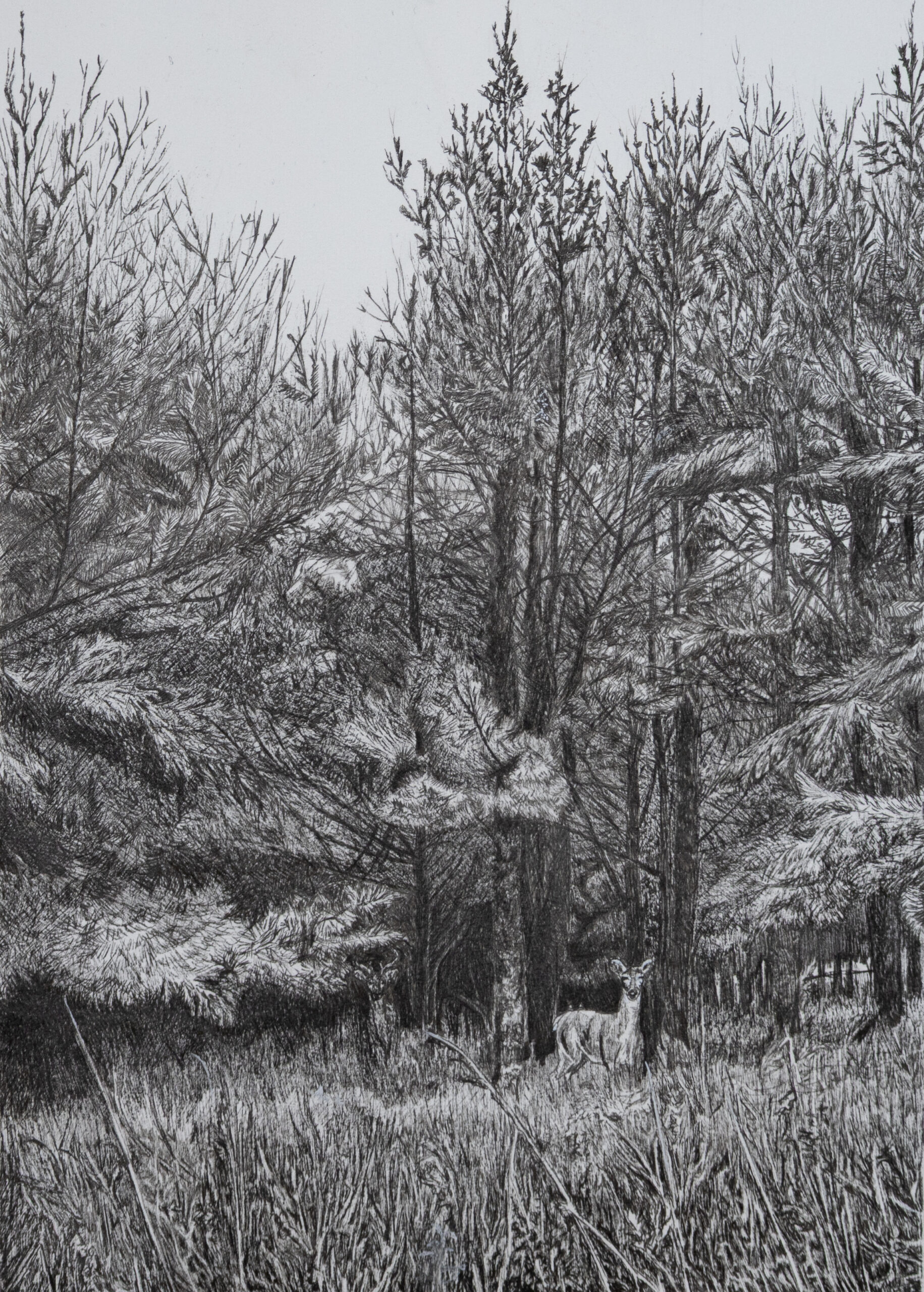 “Meet Me in the Woods” is a detailed pencil drawing that captures the peaceful stillness of a forest, with a deer quietly observing its surroundings. The rough texture of the pencil strokes adds to the natural beauty of the scene, creating an atmosphere of calm and anticipation.